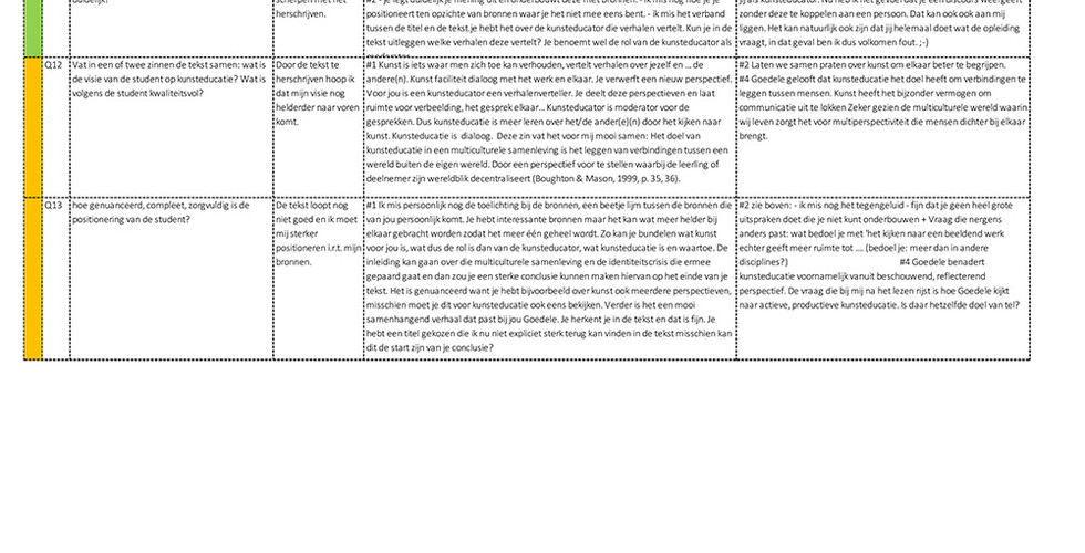 Wat betreft mijn logboek moet ik vooral de lijn in mijn onderzoek in de gaten houden. De vorm wordt wel als positief ontvangen, dus de vele uurtjes die ik daarin heb gestopt betalen zich nu toch wel uit. Ik moet wel nog duidelijker maken wat mijn eigen rol is in het geheel. Ik dacht dat ik dat in mijn relevantie wel duidelijk had gemaakt, maar daar moet ik dus ook nog naar kijken. Ook ontbreekt er nog een kritische reflectie op mijn onderzoek, het proces en het product. Het valt me op dat de opmerkingen vooral gaan over het ontbreken van een praktijkonderzoek. Inmiddels heb ik wel al een sessie gehad en hoop ik voor de deadline nog een bijeenkomst te kunnen organiseren. Dat wordt dus wel spannend. Wel ben ik van mening dat ik, doordat ik niet in de praktijk werkzaam ben, om een goed experiment te kunnen uitvoeren meer ervaring zou moeten hebben met VTS. Zelf zie ik het hele onderzoek als een soort nulmeting voor mijn kunsteducatieve praktijk die ik na de opleiding wil opbouwen. Het onderzoek stopt wat mij betreft niet na de Master. Om mijn logboek nog leesbaarder te maken zal ik bij de relevante koppen op de site een conclusie toevoegen, een korte samenvatting van mijn bevindingen. Alle feedback heb ik verzameld en aangegeven waar ik nog aan moet werken: